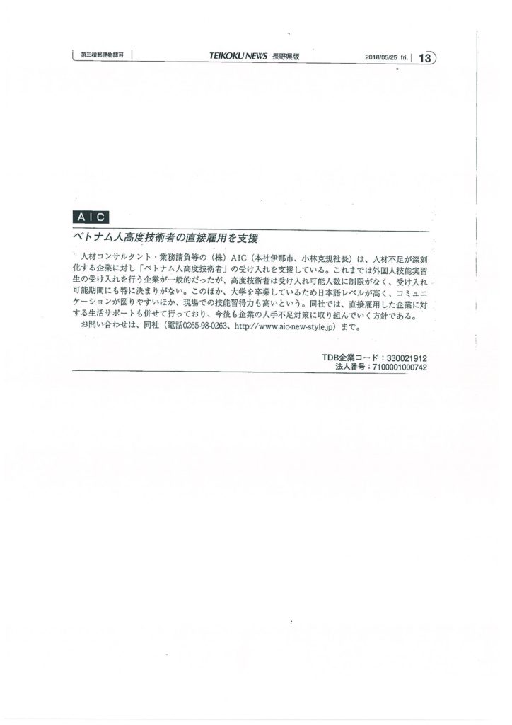 週刊帝国ニュースに掲載 作者: aic投稿日: 2018年5月18日2019年12月2日カテゴリー: お知らせ 帝国データバンク 週刊帝国ニュース長野県版に掲載頂きました。微力ながら、企業様の人材不足のお手伝いが出来ればと思っております。ベトナム人高度技術者の直接雇用を支援 人材コンサルタント・業務請負等の(株)AIC(本社伊那市、小林克規社長)は、人材不足が深刻化する企業に対し「ベトナム人高度技術者」の受け入れをを支援している。これまでは外国人技能実習生の受け入れを行う企業が一般的だったが、高度技術者は受け入れ可能人数に制限がなく、受け入れ可能期間にも特に決まりがない。このほか、大学を卒業しているため日本語レベルが高く、コミュニケーションが図りやすいほか、現場での技能実習得力も高いという。同社では、直接雇用した企業に対する生活サポートも併せて行っており、今後も企業の人手不足対策に取り組んでいく方針である。 お問い合わせは、同社(電話0265-98-0263、http://www.aic-new-style.jp)まで。 投稿ナビゲーション 不法就労 ご注意ください信濃毎日新聞 掲載