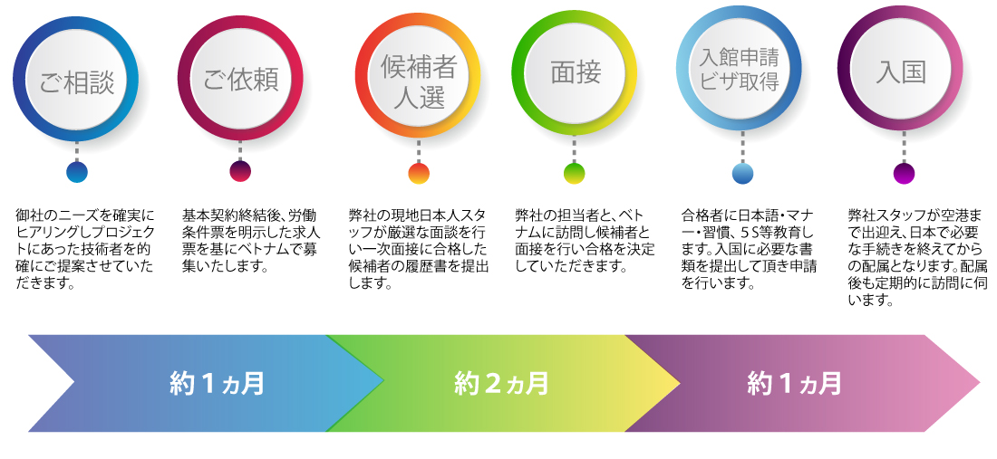 ● 在留資格認定申請書類のサポート● ビザ取得・更新書類のサポート● 入社前のご準備サポート● 技術者ご採用後の定期訪問※技術者のメンタルケア・サポート● 通訳サポート● ビザ更新のお知らせ配信● 生活サポート